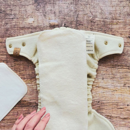 👉 Für eine funktionsfähige Windel wird der Booster in Kombination mit einer Wollüberhose verwendet.