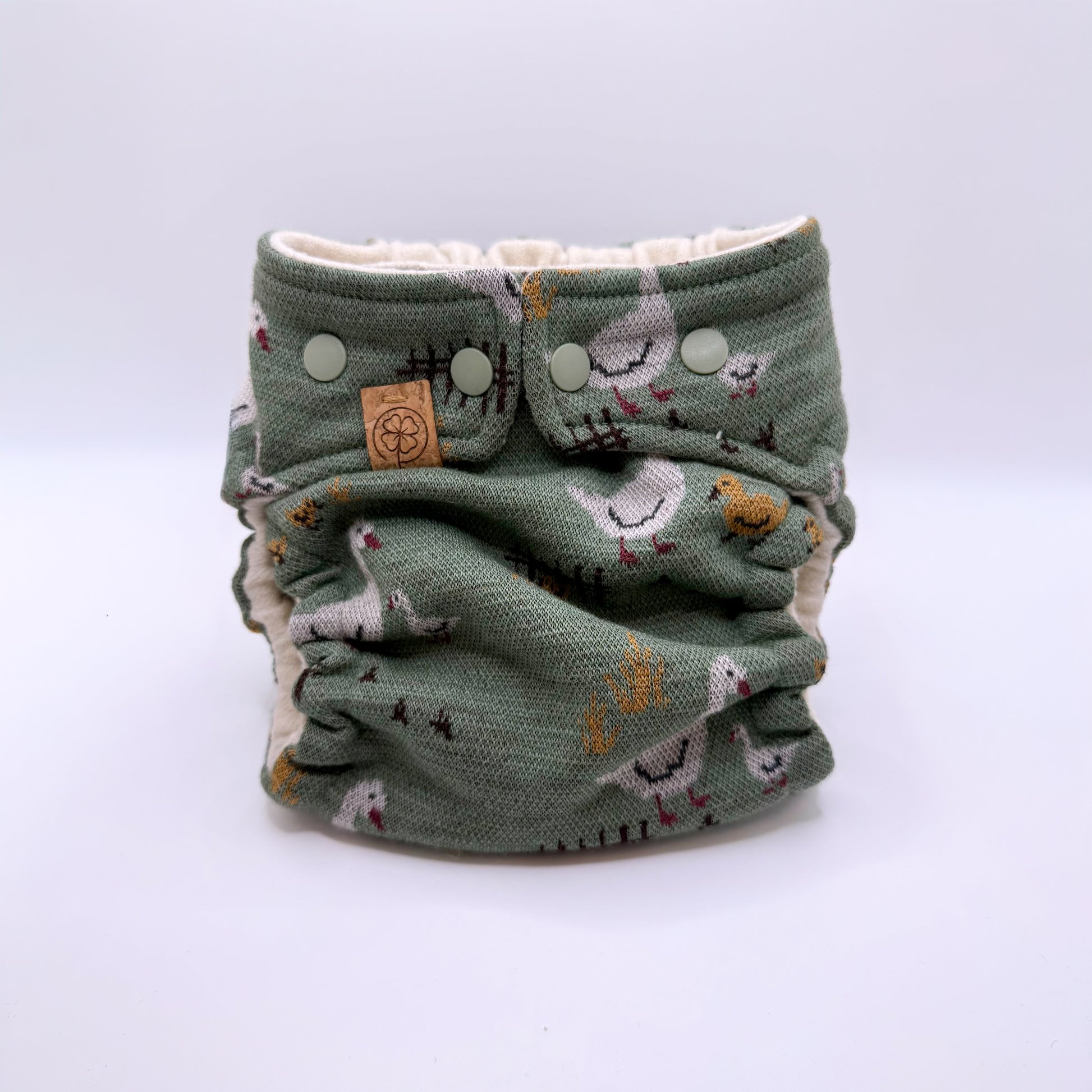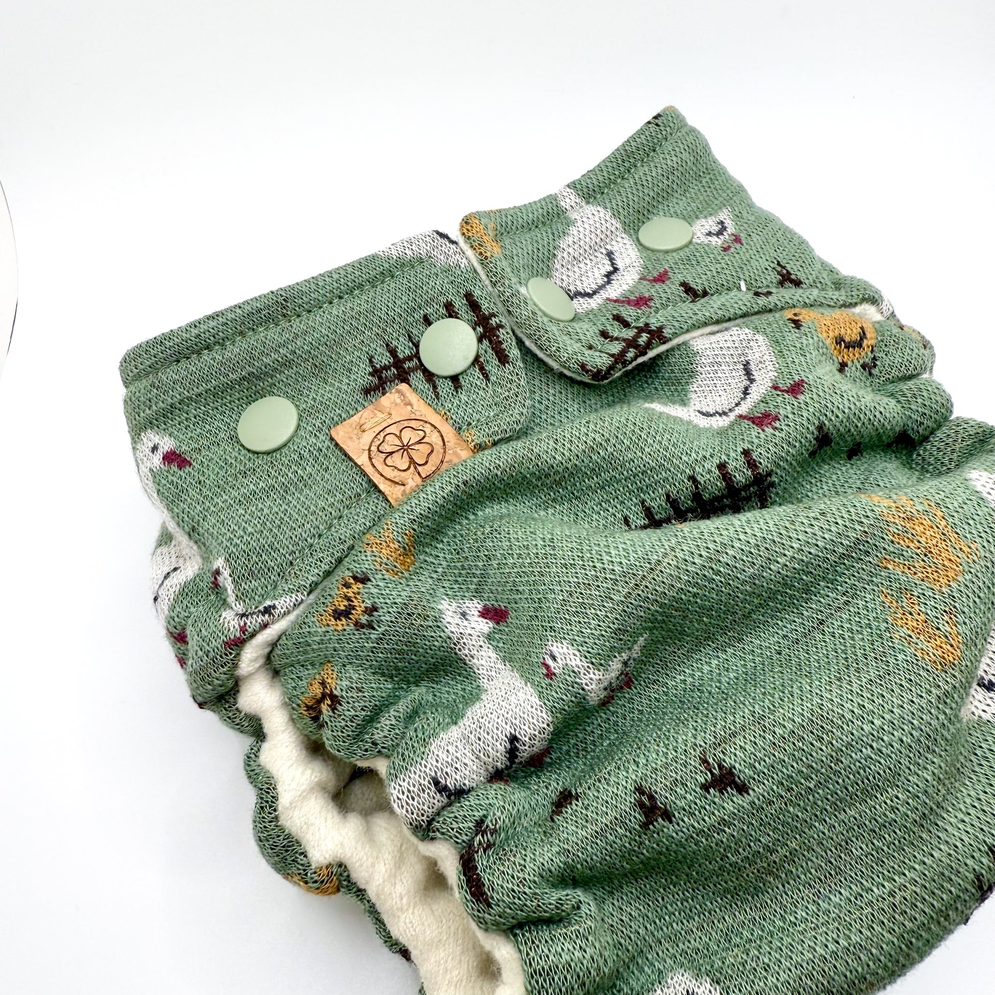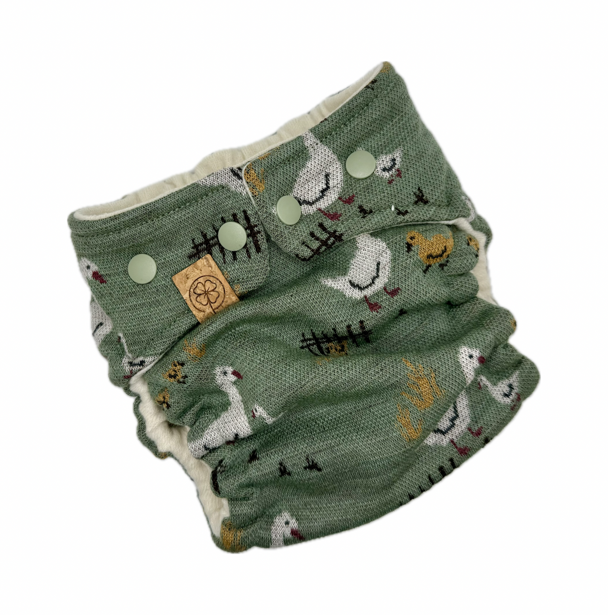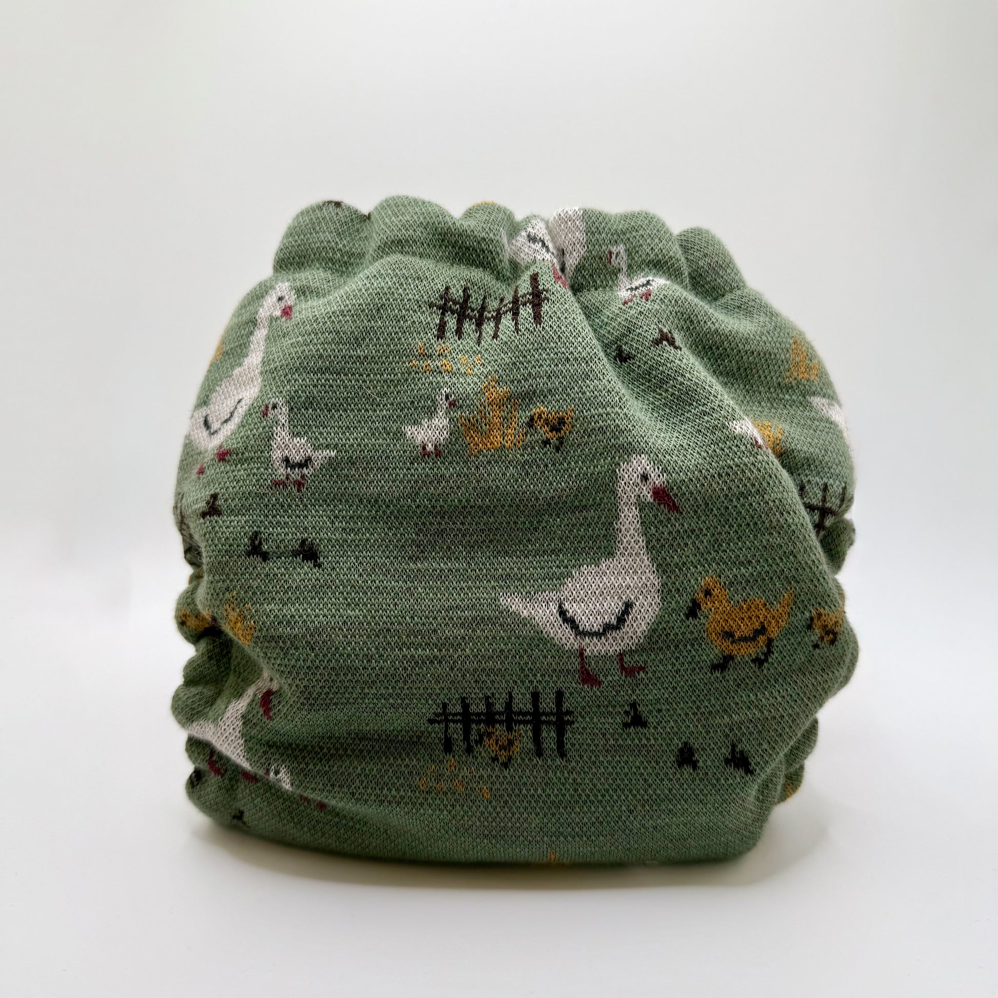 Die Wollwindel "Gänseglück" ist eine Kombination aus einem weichem Merino-Wollwalk (kbT) und einem kuscheligem Woll-Jacquard (kbT). Beide Stoffe werden aus zertifizierter Bio-Merinowolle in Deutschland gestrickt.