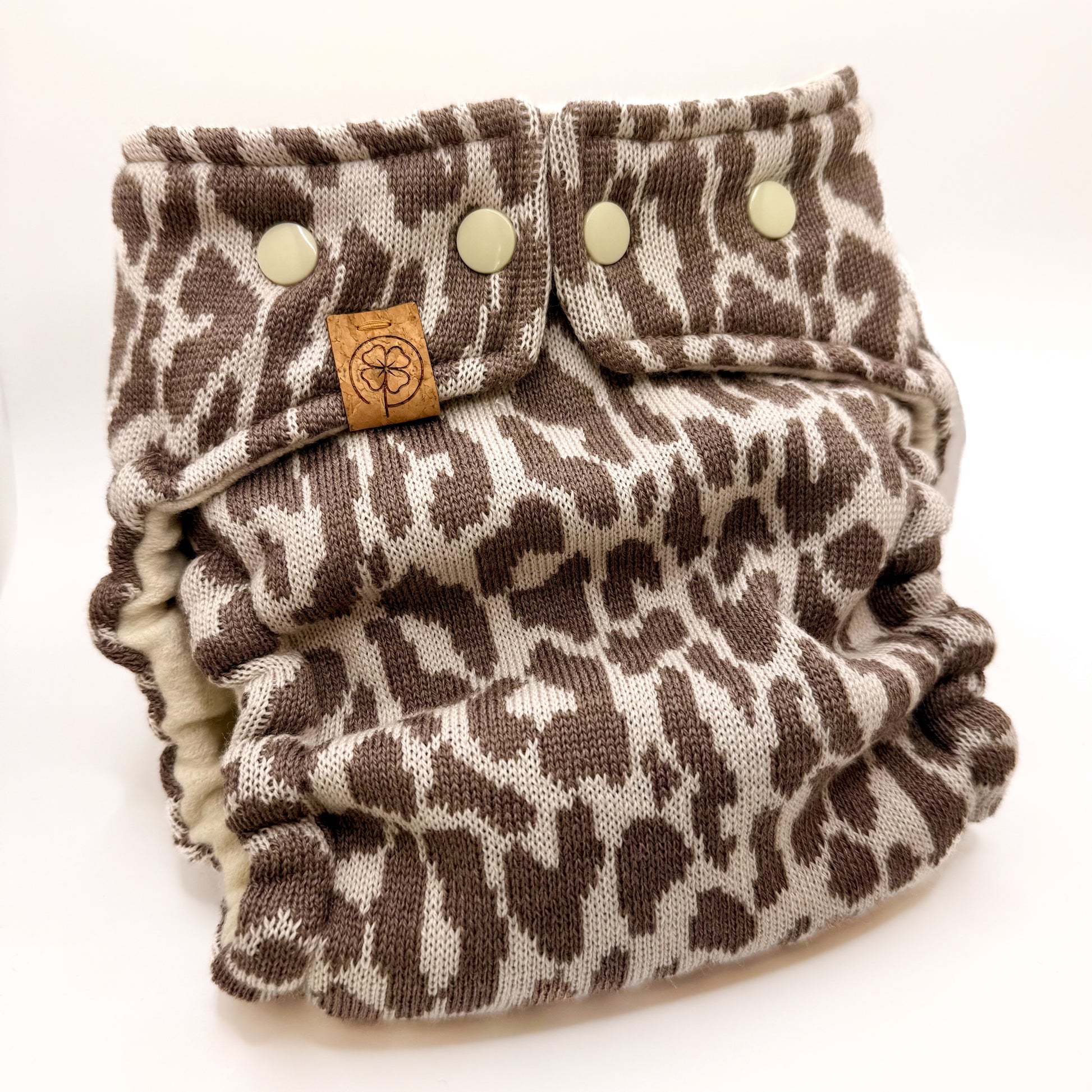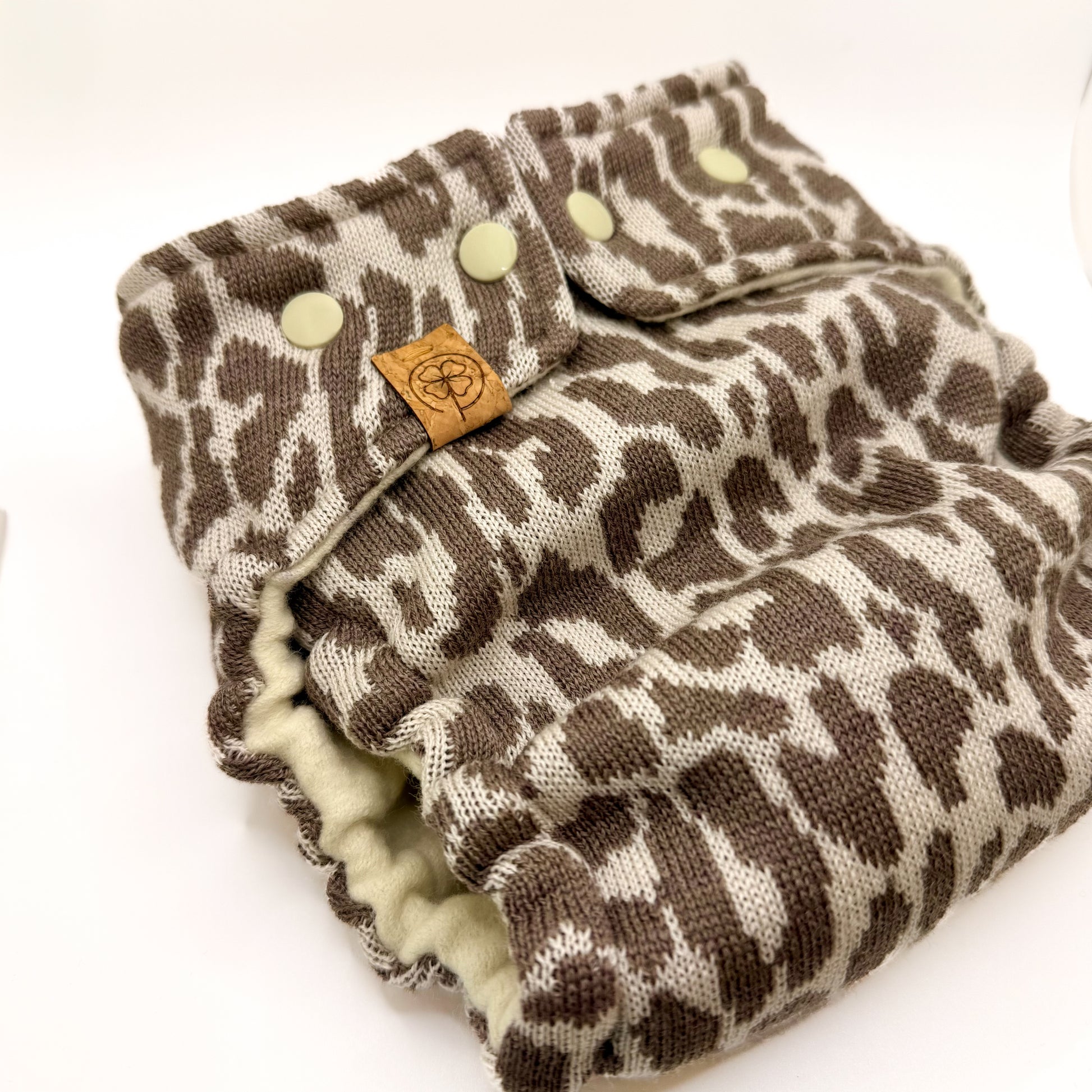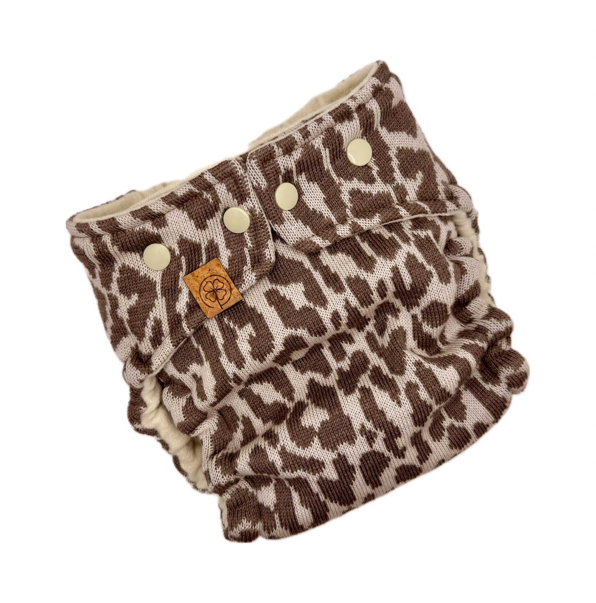 Die Wollwindel "Leo" ist eine Kombination aus einem weichem Merino-Wollwalk (kbT) und einem kuscheligem Woll-Jacquard (kbT). Beide Stoffe werden aus zertifizierter Bio-Merinowolle in Deutschland gestrickt.