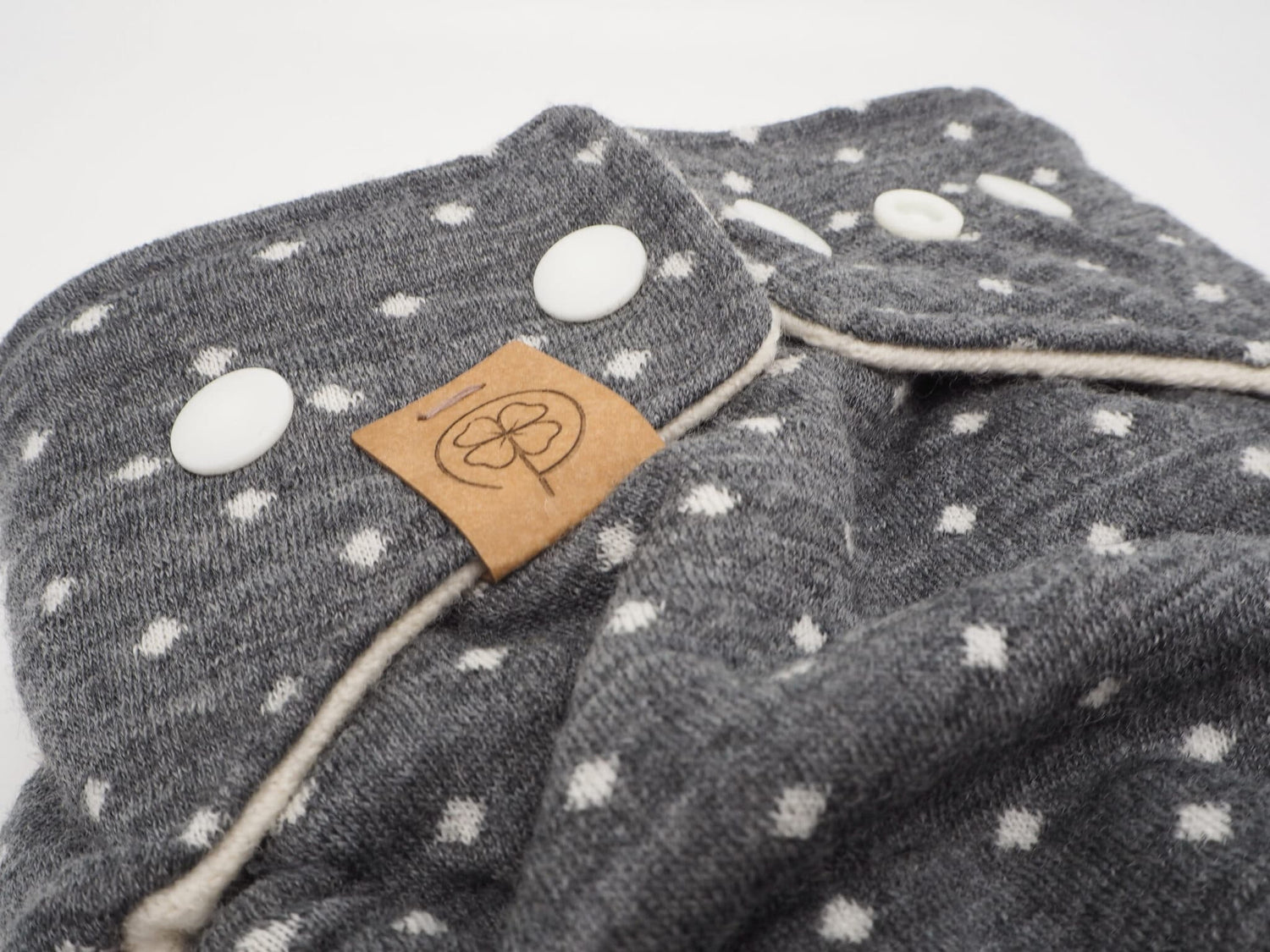 Die Wollwindel "Tausend Tupfen" ist eine Kombination aus einem weichem Merino-Wollwalk (kbT) und einem kuscheligem Woll-Jacquard (kbT). Beide Stoffe werden aus zertifizierter Bio-Merinowolle in Deutschland gestrickt.