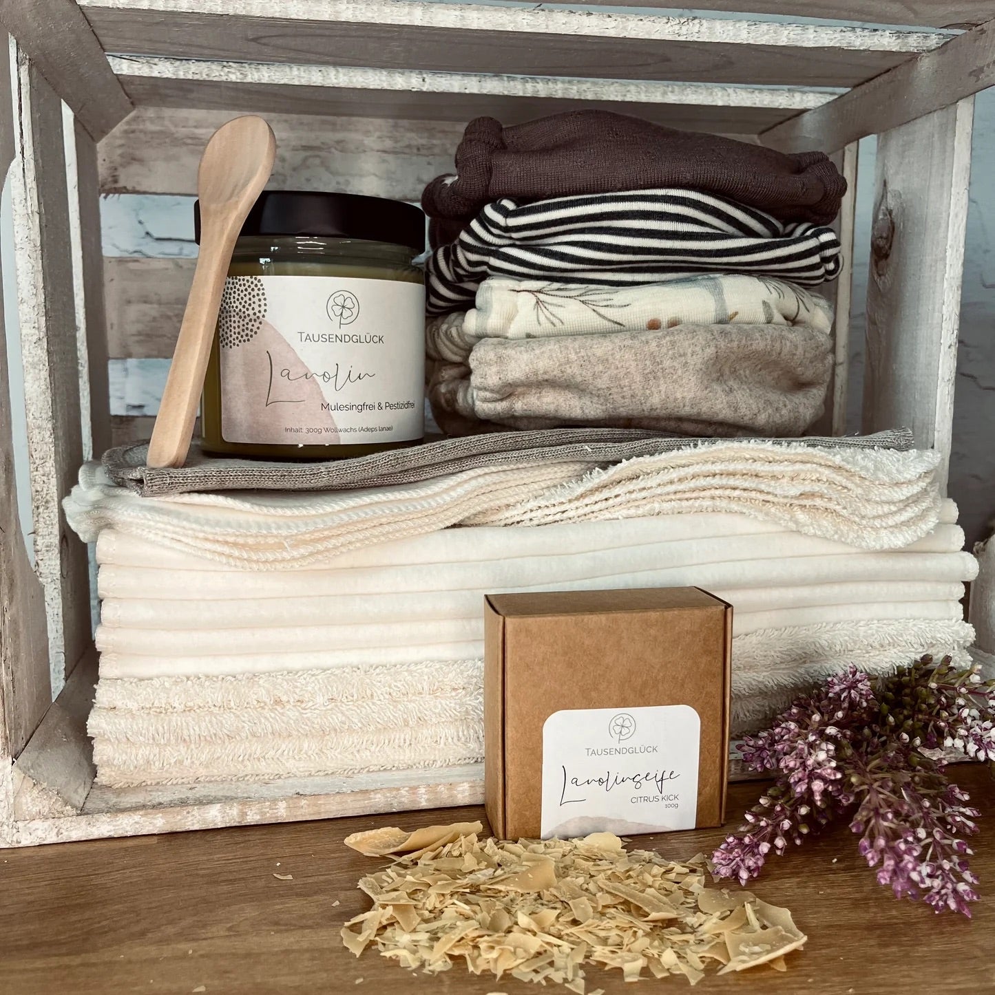 Zudem enthält das Paket alle Pflegeprodukte zum Einfetten, Pflegen und Reinigen deiner Wollwindeln. Du sparst beim Kauf des Komplettpakets rund 50 € gegenüber dem Einzelpreis.